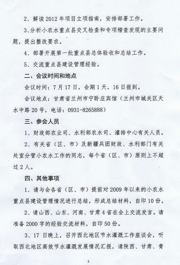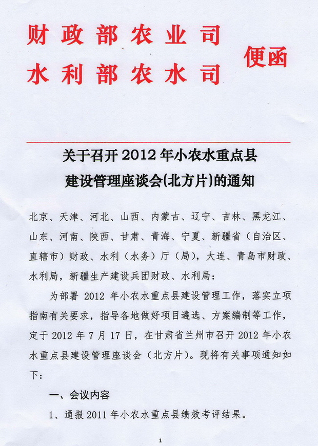 关于召开2012年小农水重点县建设管理座谈会(北方片)的通知